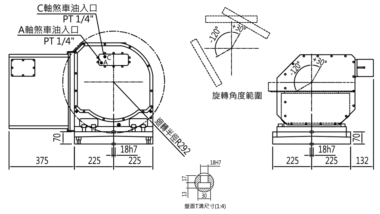 | Eje | degree | Eje giratorio (eje C), 360° | Eje de basculación (eje A), +30°~-120° | ||