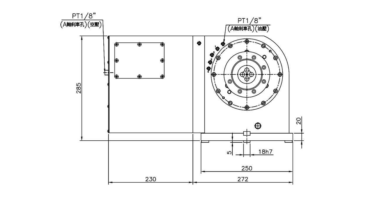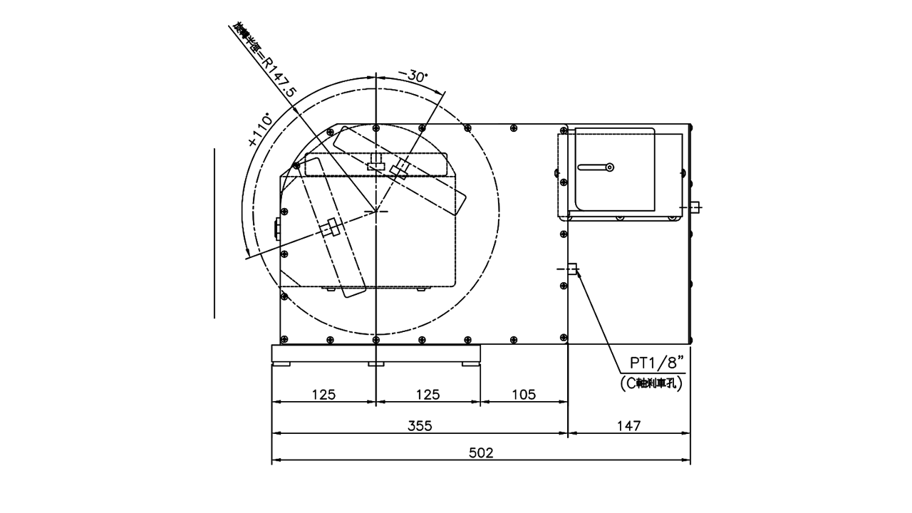 | Eje | degree | Eje giratorio (eje C), 360° | Eje de basculación (eje A), de -30° a +120° | ||